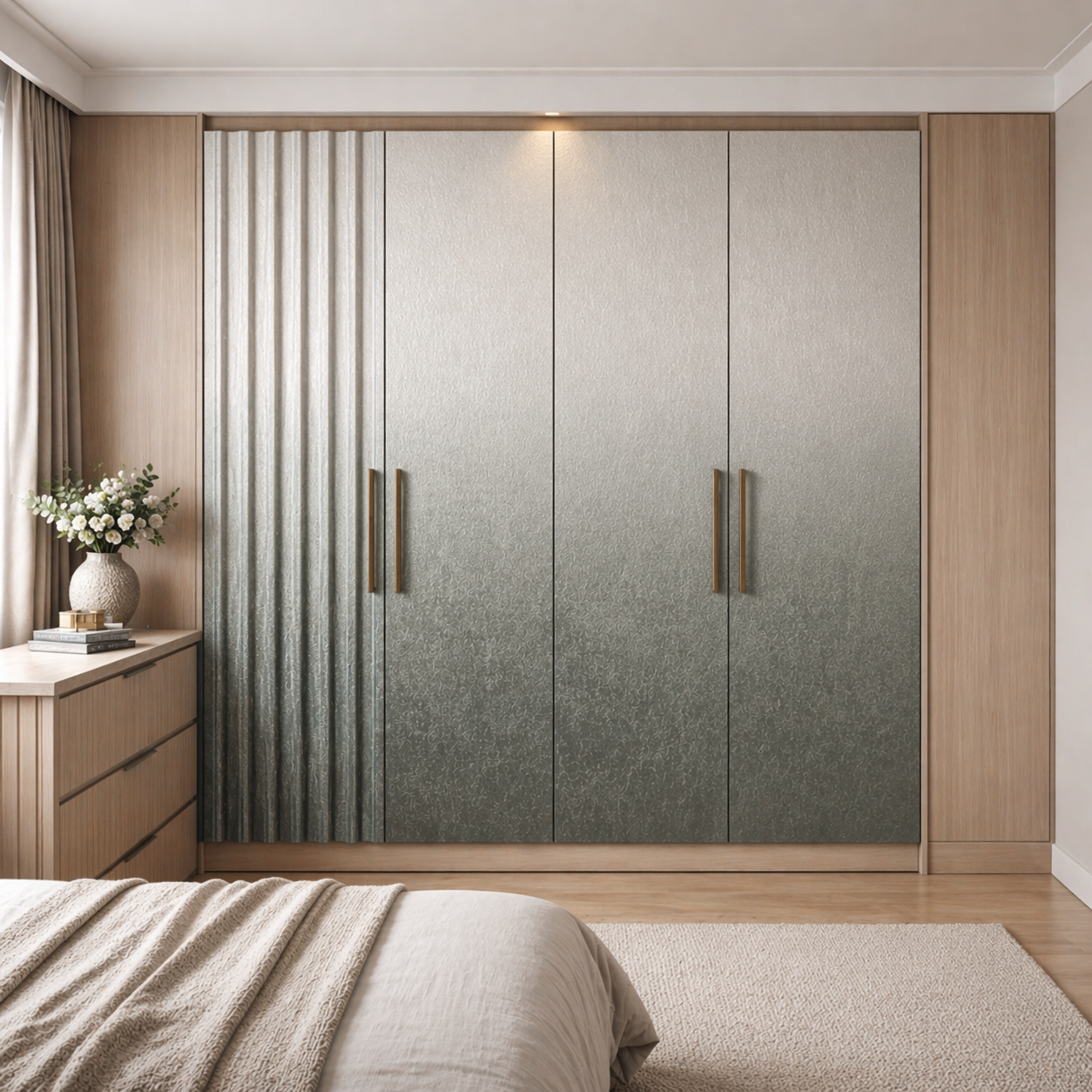 Inspired by modern architectural trends, the soft gradient laminate blends beautifully with the linear texture of the fluted panel, adding depth and dimension to any space. Manufactured using advanced technology, the laminate offers a durable and smooth surface, while the fluted panel introduces a tactile, structured finish. Together, they deliver a perfect balance of style, durability, and functionality, making them suitable for both residential and commercial applications.